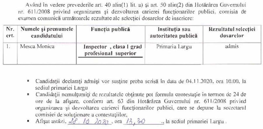 la concursul pentru ocuparea functei publice de executie vacanta de Referent, clasa III, grad profesional asistent din Compartiment Stare Civila din aparatul de